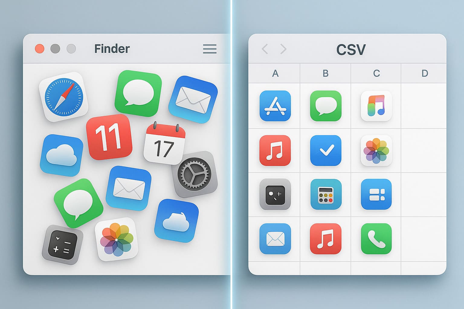 アプリが増えると整理が難しくなり、「どれが削除できるのか」「最近使っていないアプリ」を見分けにくくなります。CSVにすれば、並べ替え・絞り込み・バックアップが簡単になります。